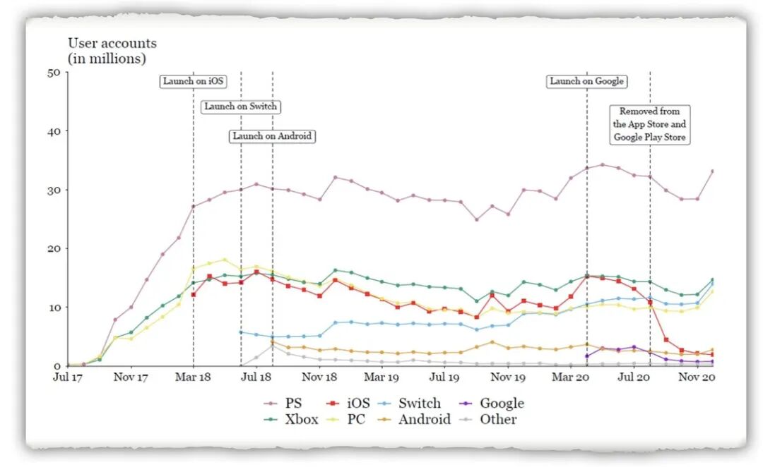 也许正是因为这样的原因,《堡垒之夜》在 PS 平台的月活用户远远高于其他平台(见下图)。