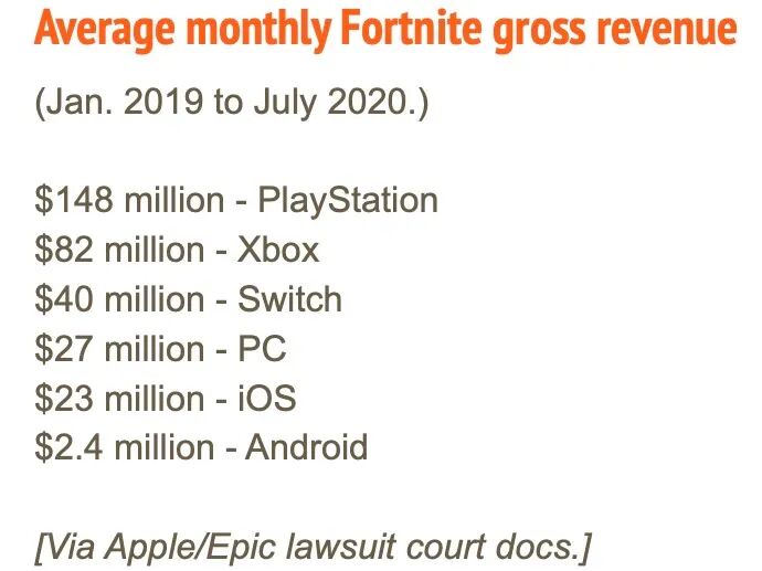 对比其他平台,PS4 是 Fortnite 的主要收入平台,占 46.8% 、Xbox One 以 27.5% 紧追在后,虽然数据没明说第三和第四名是哪个平台,但从 iOS 在收益占比 7% 是第五名来看,第三名和第四名可能是 Android 、 Switch 或是 PC 平台。Epic 的 CEO Tim Sweeney 在法庭上证实,索尼的 PlayStation 是唯一需要开发者为跨平台多人对战模式付费的平台。