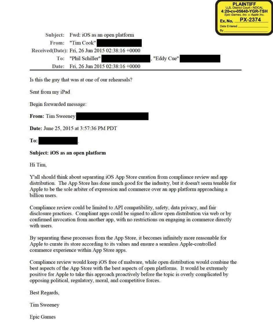 再聊聊苹果,在 2015 年 WWDC 上,Epic 在会上展示了《堡垒之夜》。几周后,Epic 的 CEO Tim Sweeney 向苹果的 CEO Tim Cook 发了一封邮件,要求苹果允许其他应用商店(暗示 Epic 商店)通过 Web 或应用自由分发和销售软件。