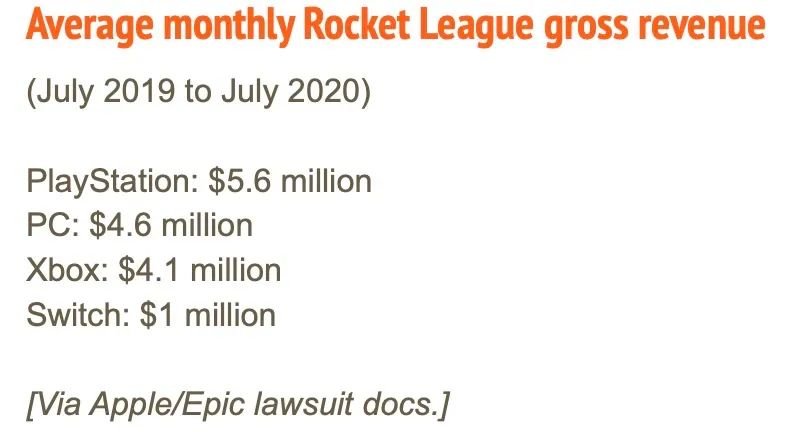 作为对照,下图是游戏《火箭联盟》在切换成基本免费游戏并登录 Epic 游戏商城前的各个平台收入。
