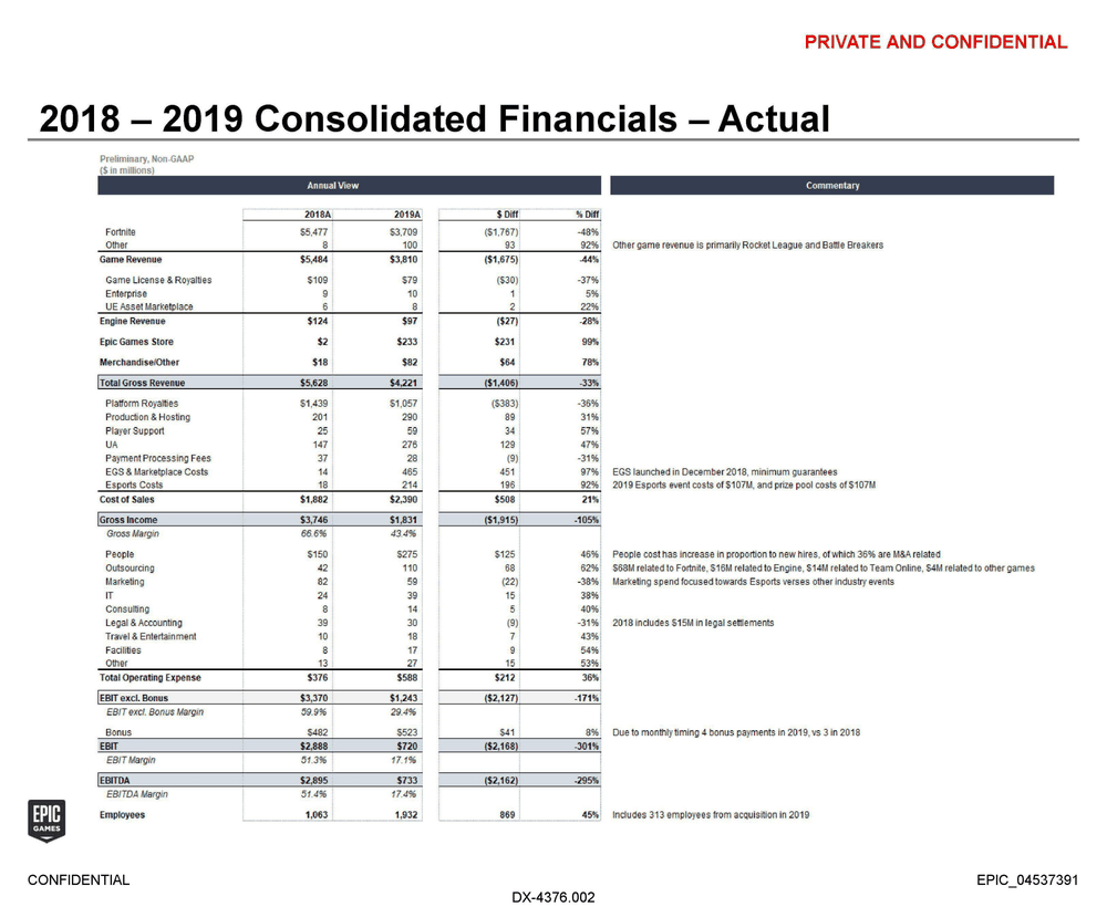 Epic 向法院公开了一份财务报表,展示了一些收入上的关键数据。