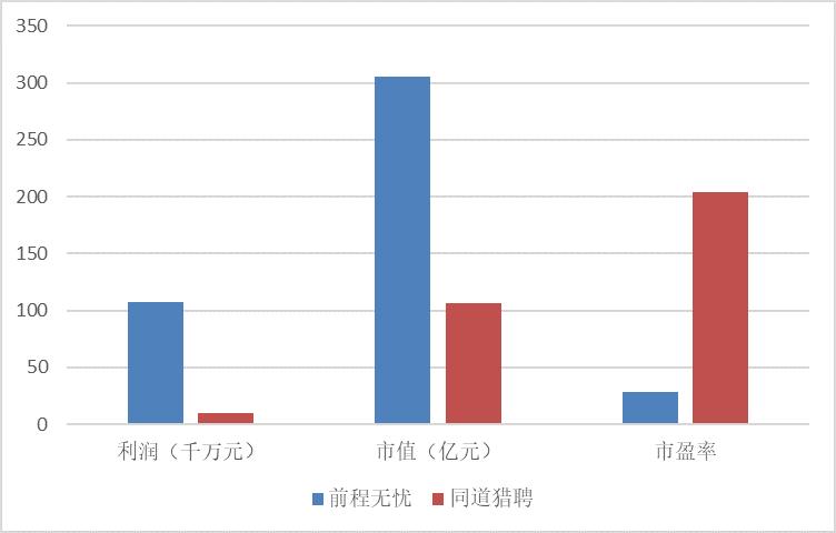 没有对比就没有伤害。从利润上看,前程无忧是猎聘的10倍;从市值上看,前程无忧是猎聘的3倍;但从市盈率上看,猎聘却是前程无忧的7倍。