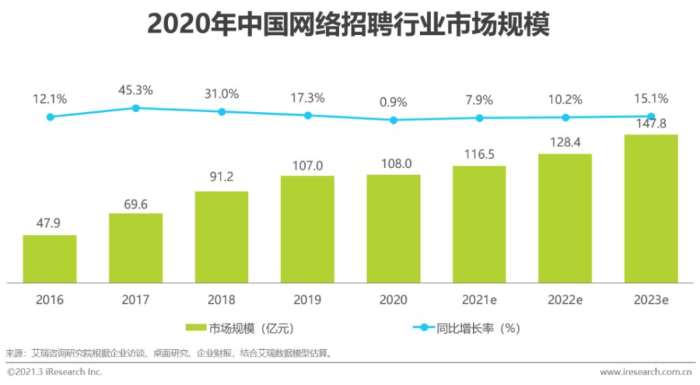 根据2021年中国网络招聘行业市场发展白皮书,2020年网络招聘的市场规模达到108亿元,其中仅前程无忧营收就占比34.2%,称得上是绝对的领军企业。