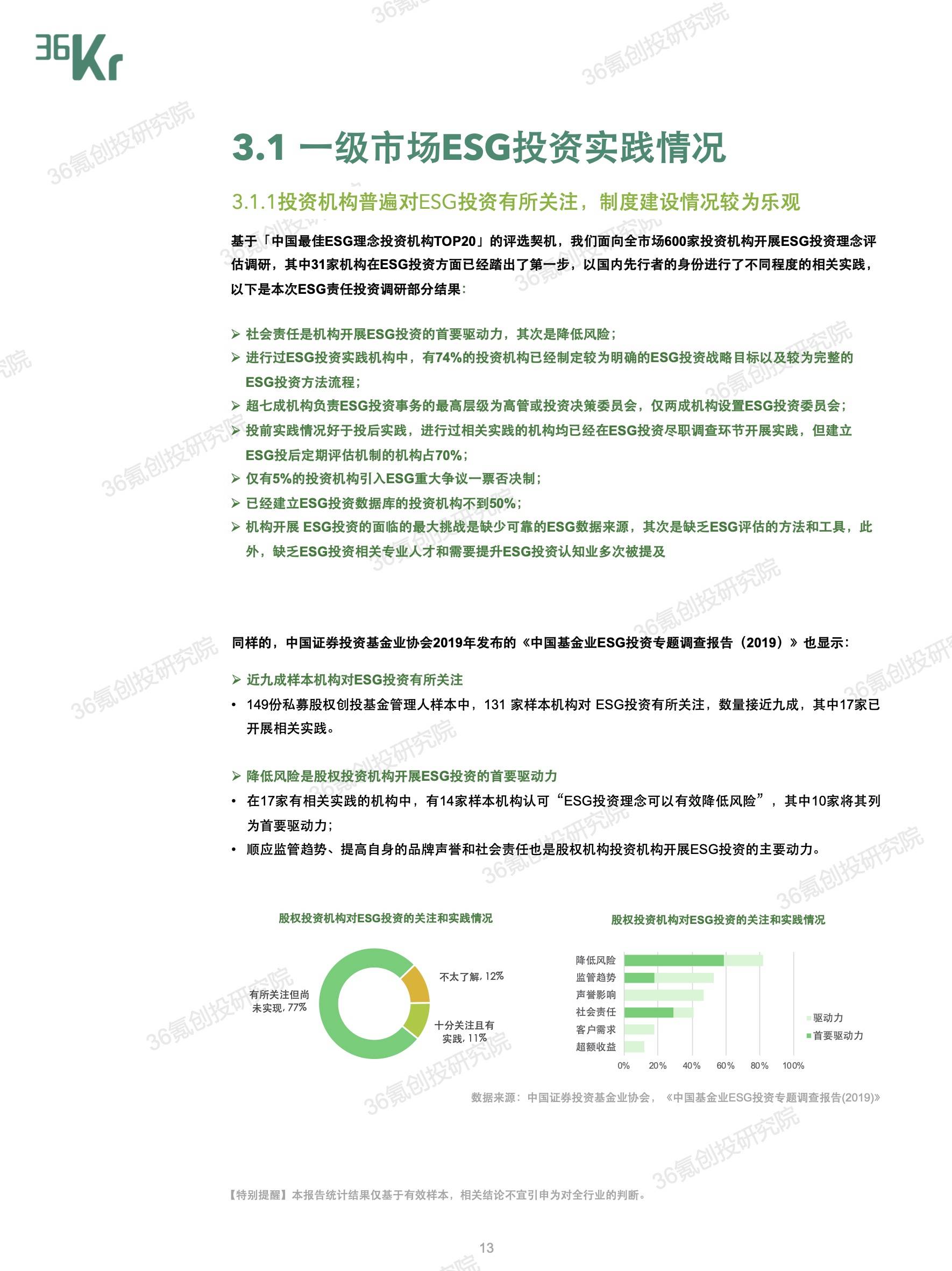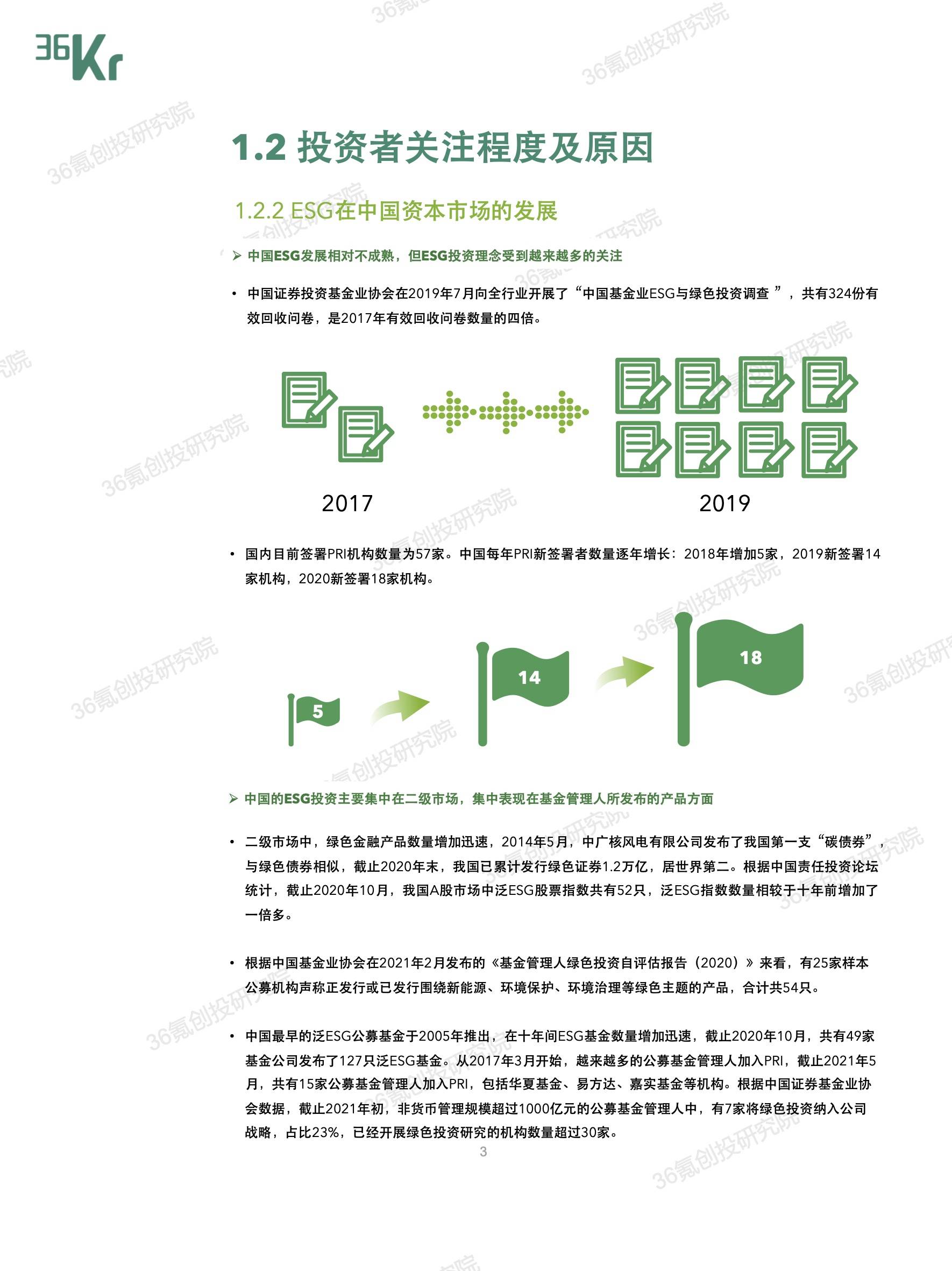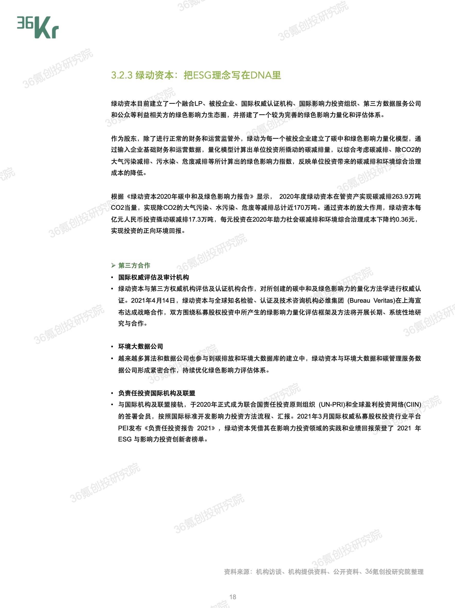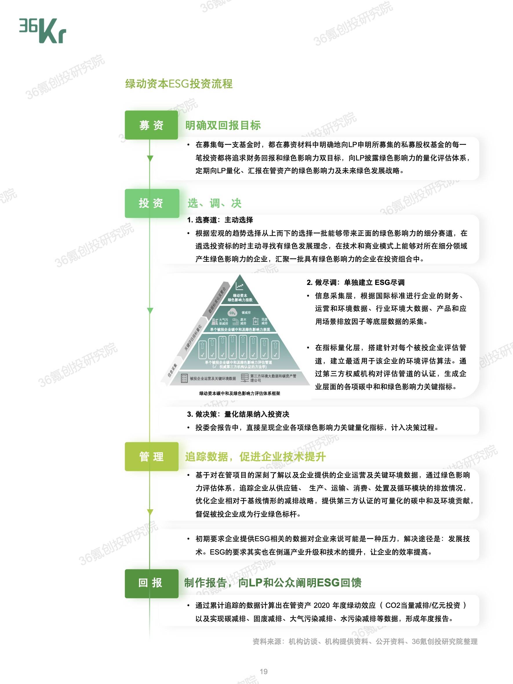 与VC/PE机构所秉持的长期主义、价值投资理念相同,ESG投资背负对企业“长期价值“实现的期待。因此,就36氪长期关注的一级市场投资机构来说,全面将ESG因素纳入“募投管退”的各个环节,不仅能够吸引国际化的资金,还能从投资源头处就有效规避风险,筛选出退出渠道更为多元的优质项目,最终实现行业的高质量发展。