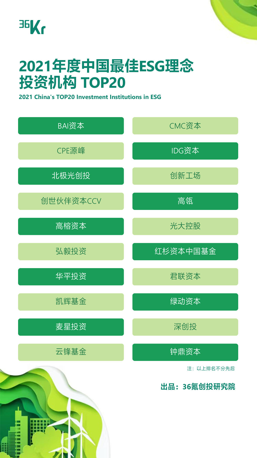 基于此,36氪在2021年首次展开对投资机构关于ESG方面发展情况的调研。并且,我们基于80%投资机构本身专业业绩,20%考察其ESG方面的理念普及和具体实践,找到了「ESG理念投资机构」。并且根据桌面研究、机构访谈等方式,撰写了「中国股权投资市场ESG理念实践报告」,以下是榜单详情: