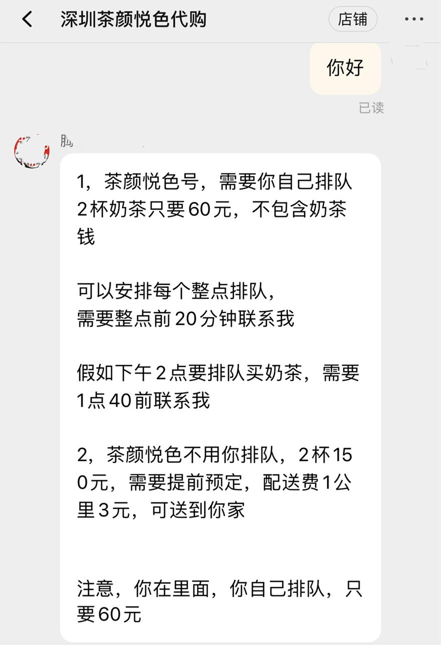 “我们帮你抢排队号,百分之百能抢到。”客服表示一个号60元,可以买两杯奶茶,付款之后他们会把具体的电子号发送到个人微信,消费者自己直接排队去购买就行。如果消费者不想排队,他们也可以安排把奶茶送到家,不过需要提前预定,2杯150元,配送费一公里3元。