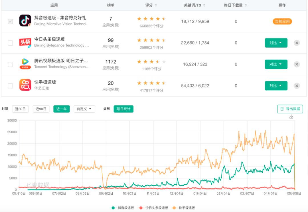 通过七麦数据显示,作为主App的极速版,排名都比较高,像抖音极速版和快手极速版在苹果应用商店内的应用免费榜单上,排名丝毫不弱于其他常用的App,而这些极速版在近一年的收入方面,呈现出上升的态势,可以作为各家的一个新的营收增长点,这也说明了类App,不仅没成为累赘,反而成为了助力。