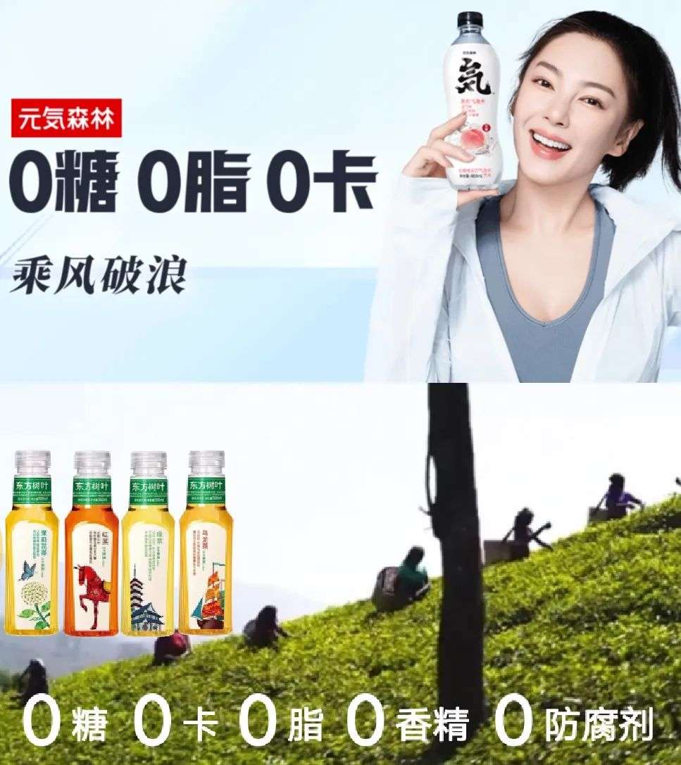分析比较一下,你会发现元气森林这个广告今天换任何一个气泡水都是可以,但是东方树叶这个内容相对而言不断强化了品牌消费者对于品牌从茶原材料、茶的树叶的认知。当然品牌也增加了新的功能点,因为学习了元气森林讲的三个零的角度表达,品牌原来不讲五个零的,现在也讲五个零,这就是多少有一些变化在里面。