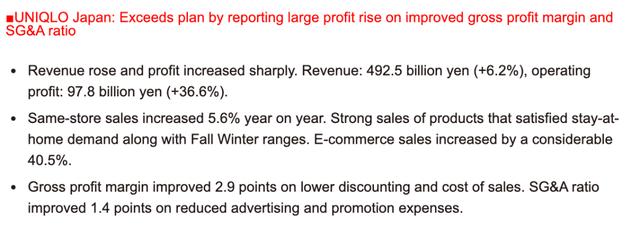 优衣库更把电商表现和目标写进每季度财报的重点摘要里。2021上半财年最新数据显示,日本优衣库的电商零售增长了40.5%。