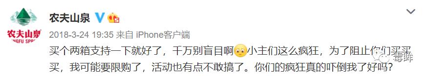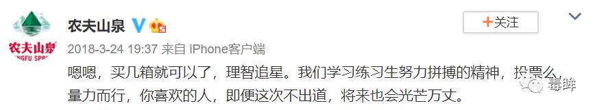 《偶像练习生》时期农夫山泉官博曾经劝导粉丝们“理智追星”的言论,也被拿出来和真果粒进行对比。愤怒的粉丝们在真果粒的道歉微博下留言:“你们把投票码印瓶盖里的时候是怎么想的?现在又怪到消费者头上?”