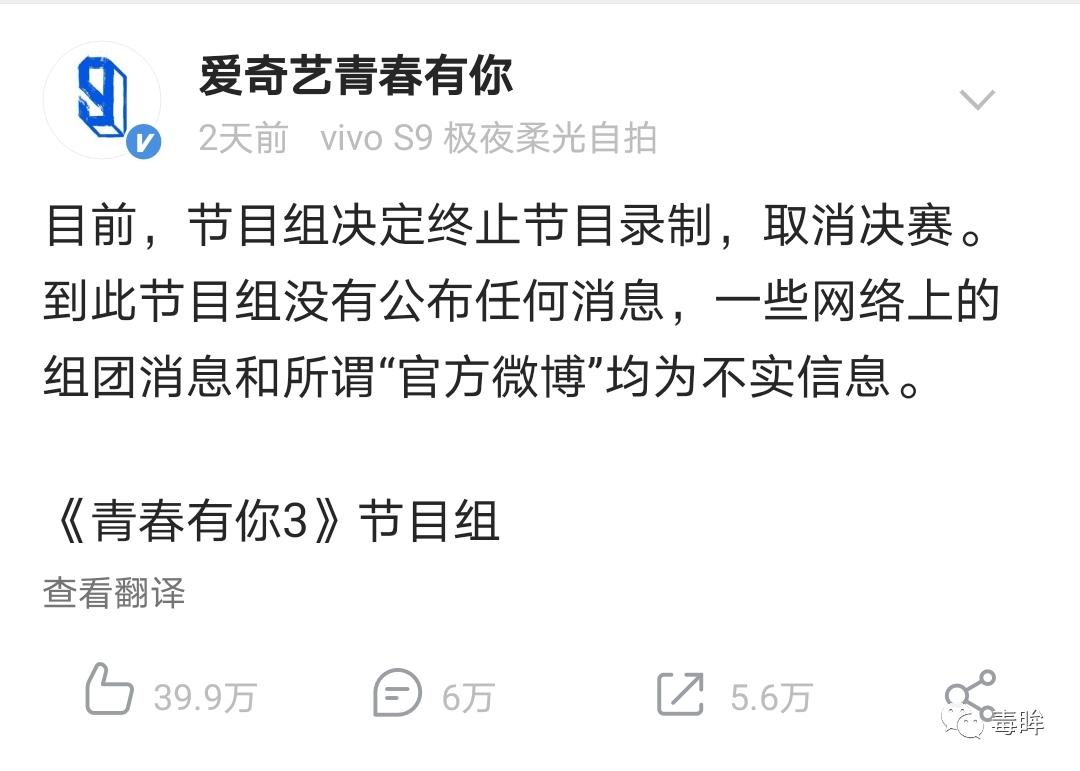 《青春有你3》目前进入无限期停播状态。“目前,节目组决定终止节目录制,取消决赛。到此节目组没有公布任何消息,一些网络上的组团消息和所谓“官方微博”均为不实信息。”5月9日,针对网上多条传闻如“召回选手录制决赛”“定了团名”等,@爱奇艺青春有你 官微回应道。