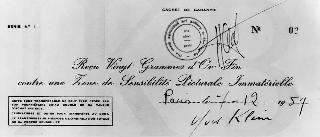 当藏家购买了这件(可以无限复制的)“作品”的其中一版,他们只会收到一张纸质收据。但克莱因声称,藏家如果想要真正地拥有《区域》这件作品,必须把这张(字面意义上)的“代币”烧掉,只有这样,作品才能成为藏家“感性”的一部分,而且无法被转售。