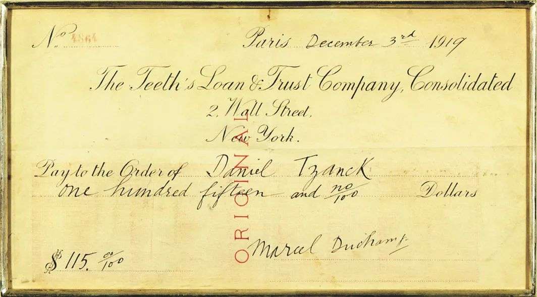 马塞尔·杜尚,《赞克支票》,1919,纸上墨水,8 1⁄4 × 15".