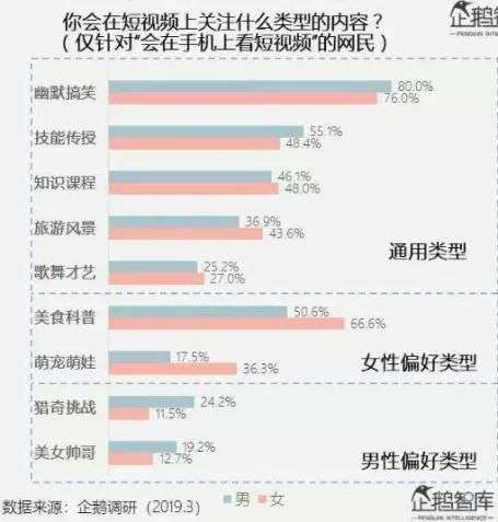 70%以上的网民看的是搞笑段子。女性偏好美食萌娃,男性偏好猎奇挑战,以及帅哥美女。