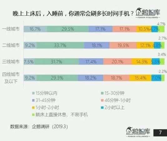 不论一线还是四线城市,上床不刷手机直接休息的人都是最少的,在三线城市,有20.1%的网民会刷46分钟到1小时。在四线城市,有7%的网民刷两小时以上。