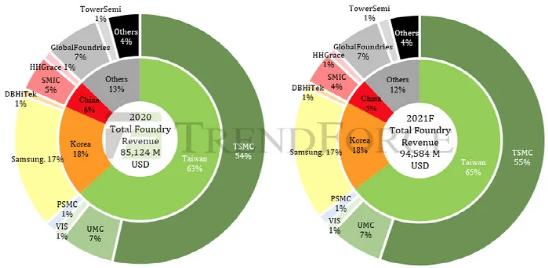 根据台湾研究机构TrendForce的数据,台积电正在加速其主导地位,在2021年前三个月积累了56%的合同制造份额,比去年同期增长了2个百分点。这一份额比两年前增长了8个百分点,而同期排名第二的三星的市场份额减少了1个百分点。