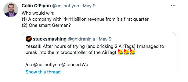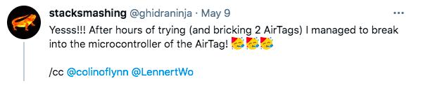 这名德国安全研究人员 Stack Smashing 在推特上透露,他能「闯入」 AirTag 的微控制器中。