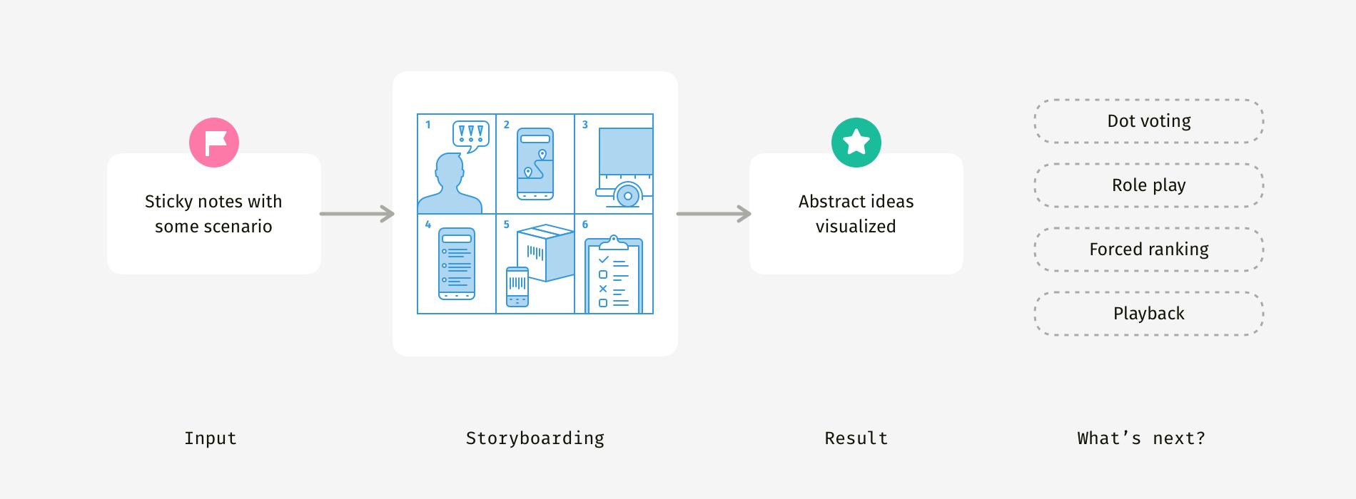 例子:一个团队已经制作了一系列的便笺,这些便签被用来描述使用新Web app的过程。但是,这种序列太过含糊,而且很难想象。你要求大家拿出纸张,画出这一场景下6到8个关键帧的草图。这样一来,参与者就能够想象出用户究竟会如何跟app进行交互。