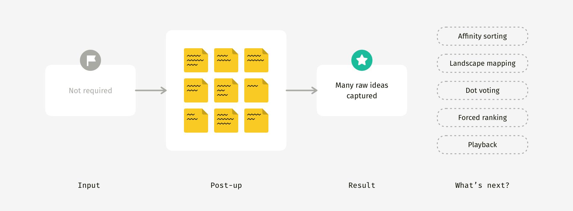 例子:你邀请了市场营销,技术和客户支持方面的专家,这些人各都有不同的经验和目标。你以及被邀请的人对于谁在想什么都没法了解全貌。你要求团队在便签上写下自己的意见。这样,你就可以得到一幅全景图,而不是不确定性。