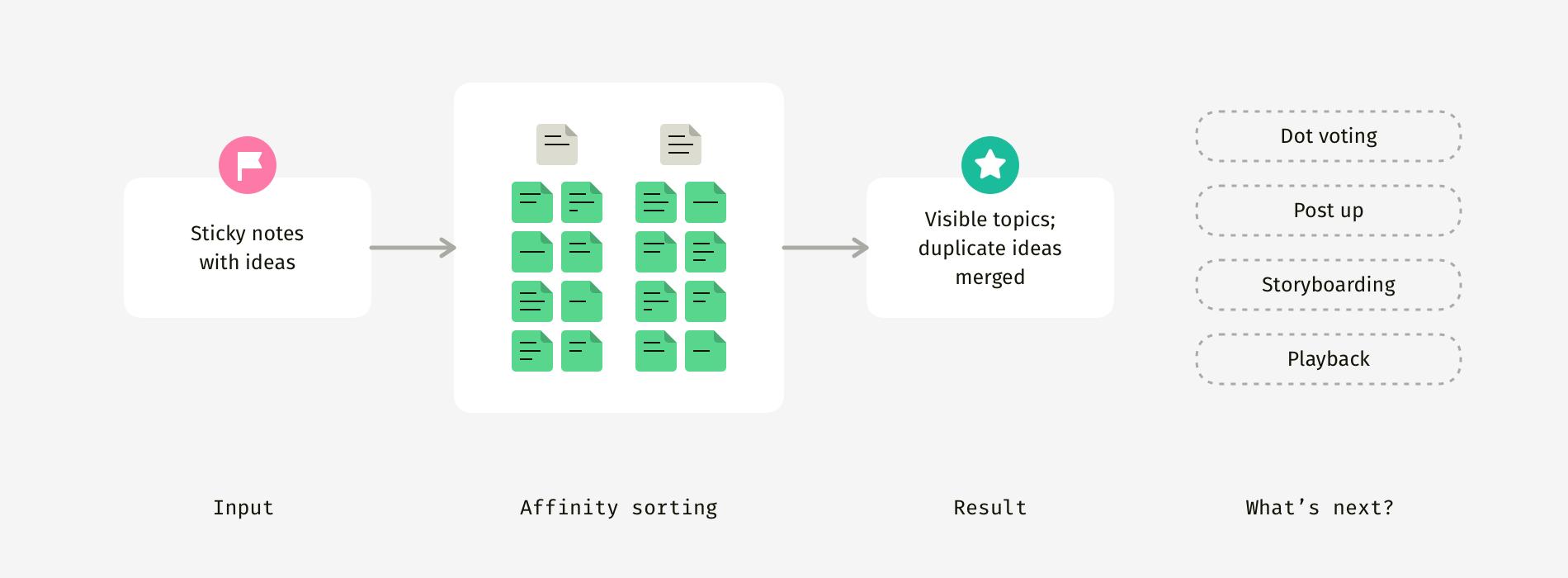 例子:一个团队为新的移动app制作了一百条想法便笺。换句话说,有些便签其实说的是同一件事,只不过说法不一样而已,而且往往信息太多了。你要求大家将相关的想法归为一组,把重复的内容粘贴在一起,并对分组进行命名。经过整理之后,你只得到了几个主题,而不是各不相干的想法。