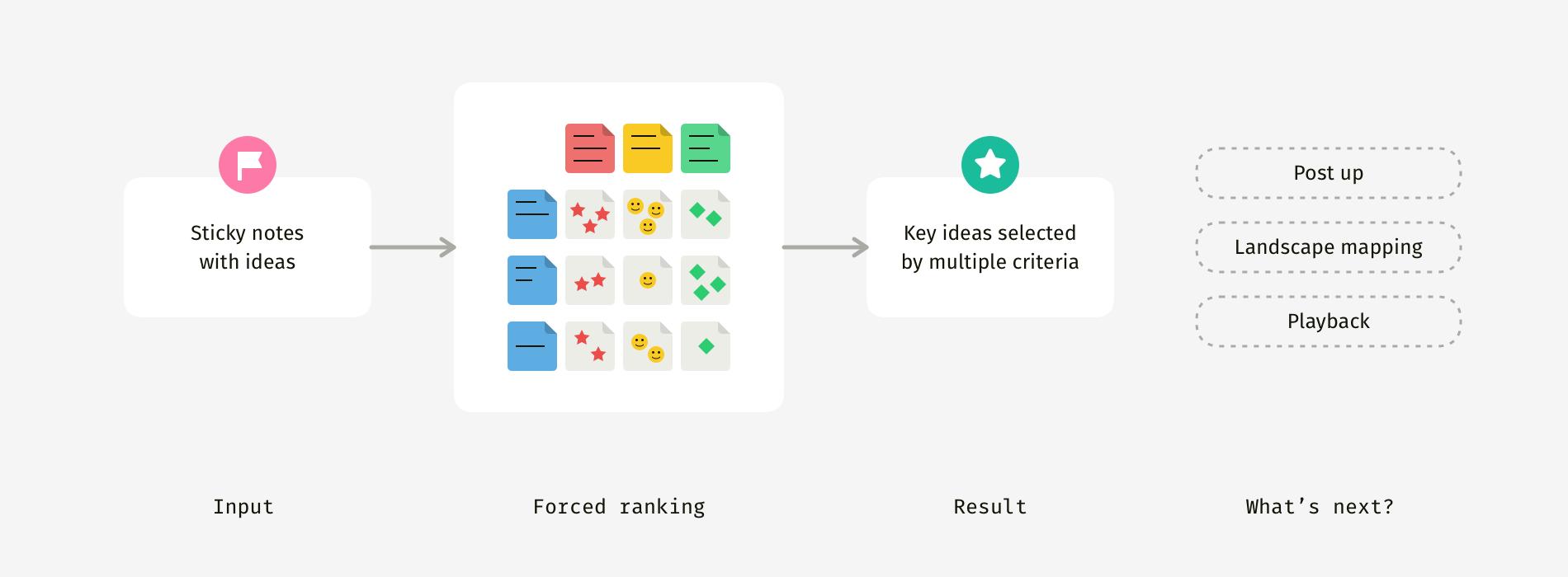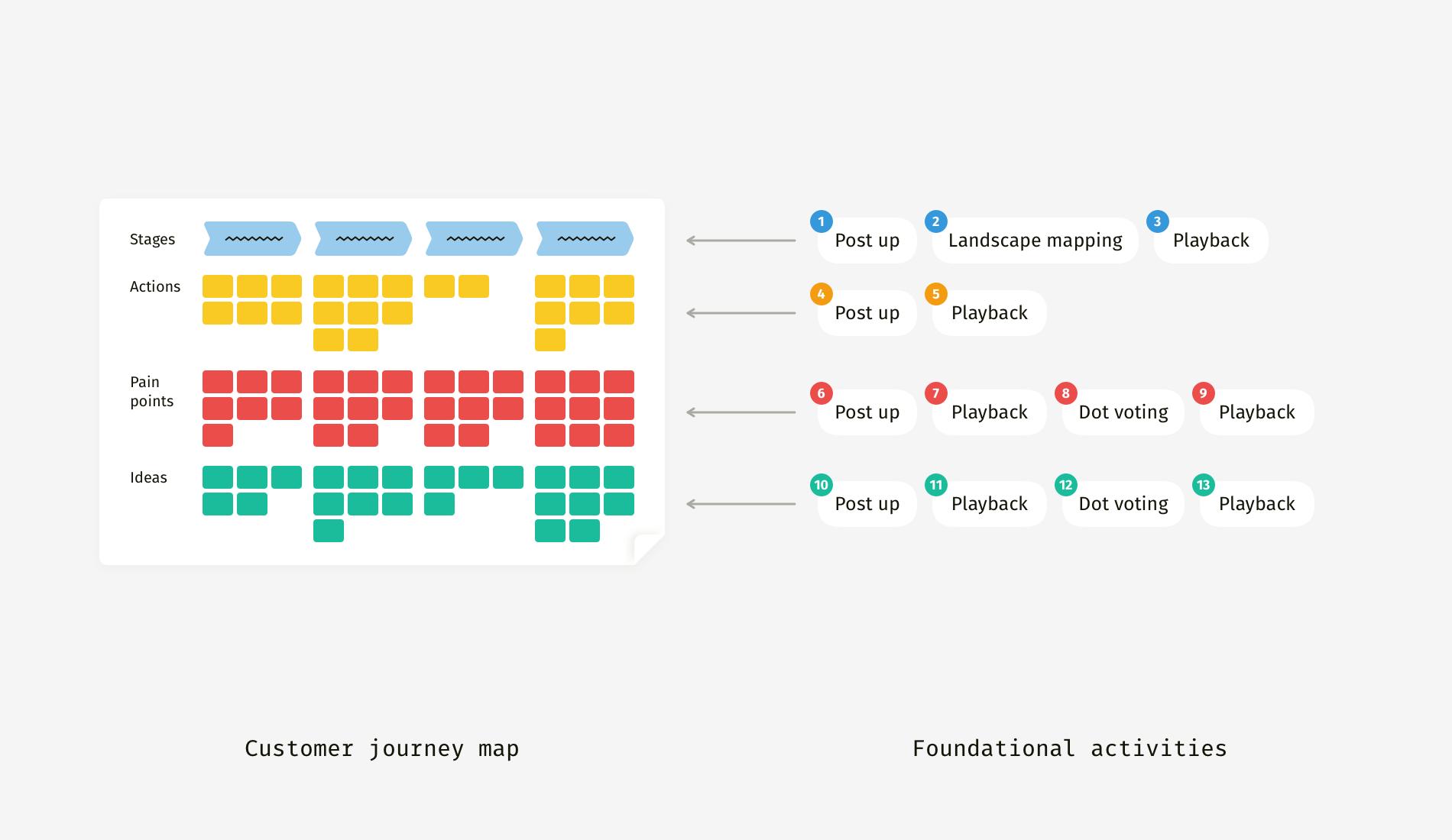 看出来我们是怎么剖析复杂的工作坊了吗?工作法不是火箭科学,而是一系列相互依存的活动。上一步的输出会成为下一个步骤的输入。其实它非常简单:你只需要先定义好阶段,去映射相关的用户操作;用户操作可帮助回忆起痛点;最后,解决方案点子则解决那些痛点。中间进行两次投票是用来帮助避免失去焦点。