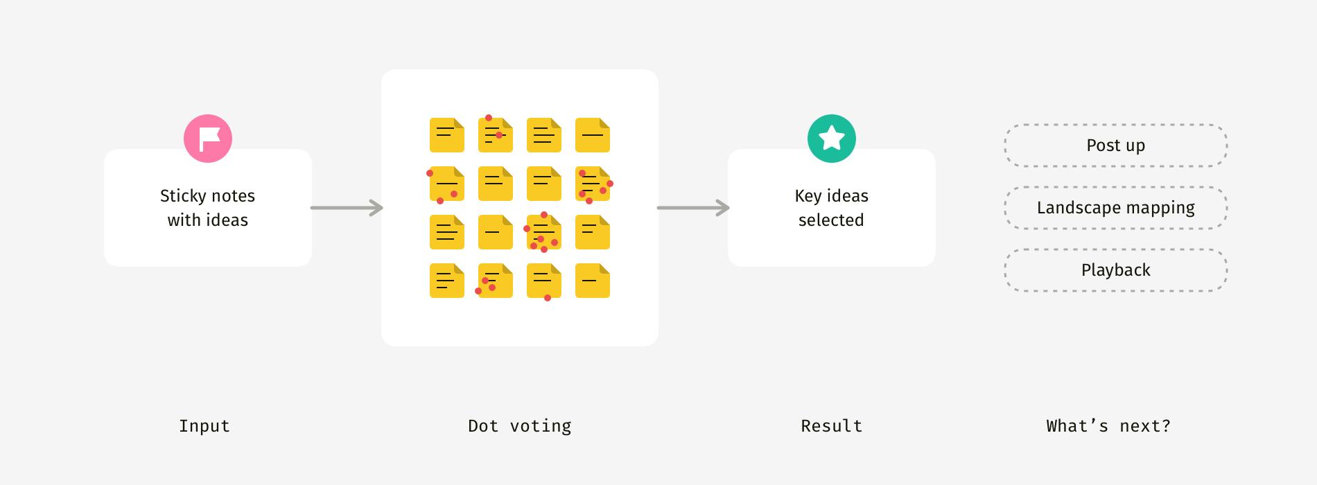 例子:团队成员制作了很多有关用户痛点的便笺。不幸的是,所有问题不可能一次性就解决掉,所以你必须决定暂时搁置哪些东西。你会给每位参与者三张点点贴,并要求他们给最关键的痛点投票。最后,团队就可以把焦点放在得票最高的事项上。