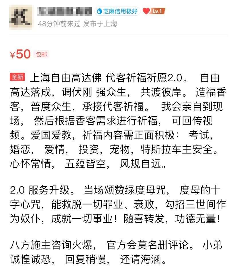 不过让人十分迷惑的是,除了五一假期吸引了大量高达迷纷纷前往现场打卡之外,某二手交易平台上还出现了“代客祈福”的神秘服务——仅需支付数十元,就有专人前往自由高达立像处进行祈福。