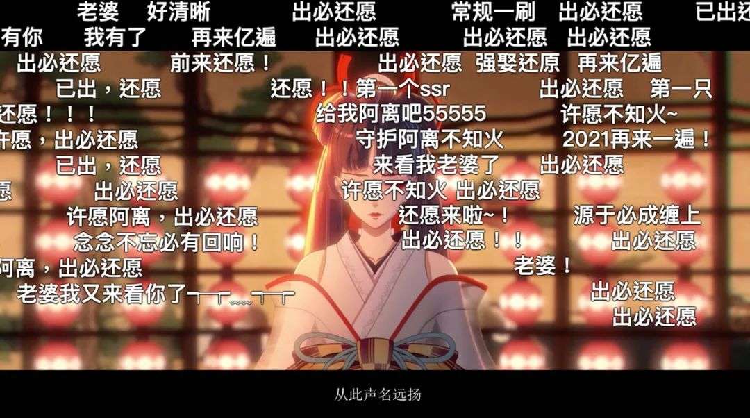 比如《阴阳师》手游发布的许多游戏宣传视频里,就会经常能看到“许愿XX”、“出必还愿”、“还愿”的弹幕留言。这就是游戏玩家特别渴望入手SSR式神的典型表现。