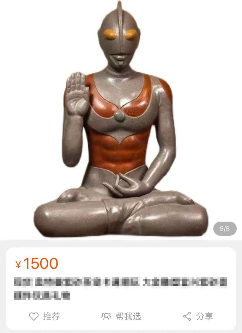 比如在某电商平台上,随便一搜就能看到用紫砂、水晶琉璃、黑檀木等材质制作的奥特曼造像。虽然它们的姿势各不相同,但在网络传言中,这些奥特曼神像的作用,无一例外都是能够带来“世界和平”。