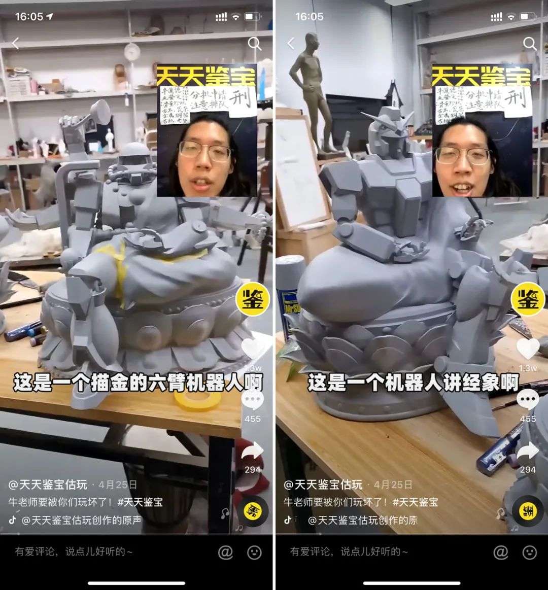 无独有偶,前段时间还有人将自己以RX-78-2高达、MS-06S红扎古为题材制作的神像,专门通过在线鉴宝的方式拿到某知名文玩博主处进行鉴定,并获得了“就冲这题材,起码能值两年脑血拴”的评价。