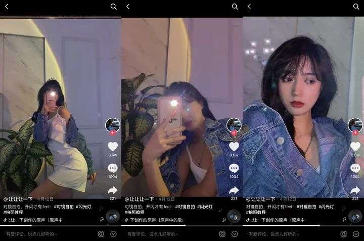 还有一些网红的拍摄教程里,习惯打开闪光灯对着镜子自拍。从成片效果来看的确很酷,但拍摄之前要确认镜子是否足够干净,以及面部是否出油、背景的亮度是否合适。