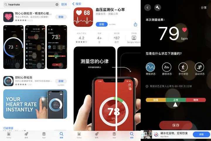 闪光灯还能怎么用呢?应用商店里可以查找到许多测量心率的 app,只需要将手指放置在镜头模组上,覆盖闪光灯与镜头,软件便可以通过算法测算心率了。不过这种测算方式存在许多可变因素,看起来并不严谨,只能当做参考。