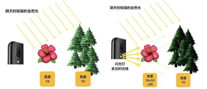 就像下面这样图,右侧开启了闪光灯拍摄的花朵,比左侧未开启的主体更突出。囿于手机闪光灯的亮度,在阴天或者环境光稍暗时,效果才会比较明显。