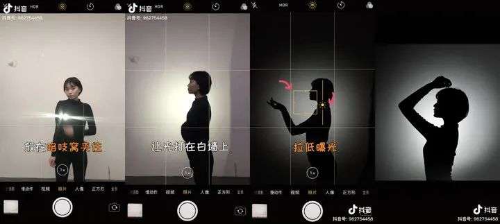 或者利用闪光灯,创作极简剪影。将手机的闪光灯打开,用胳膊夹住,侧站在墙面前。关闭室内灯光后,拉低手机曝光值,便可拍出美妙的剪影。