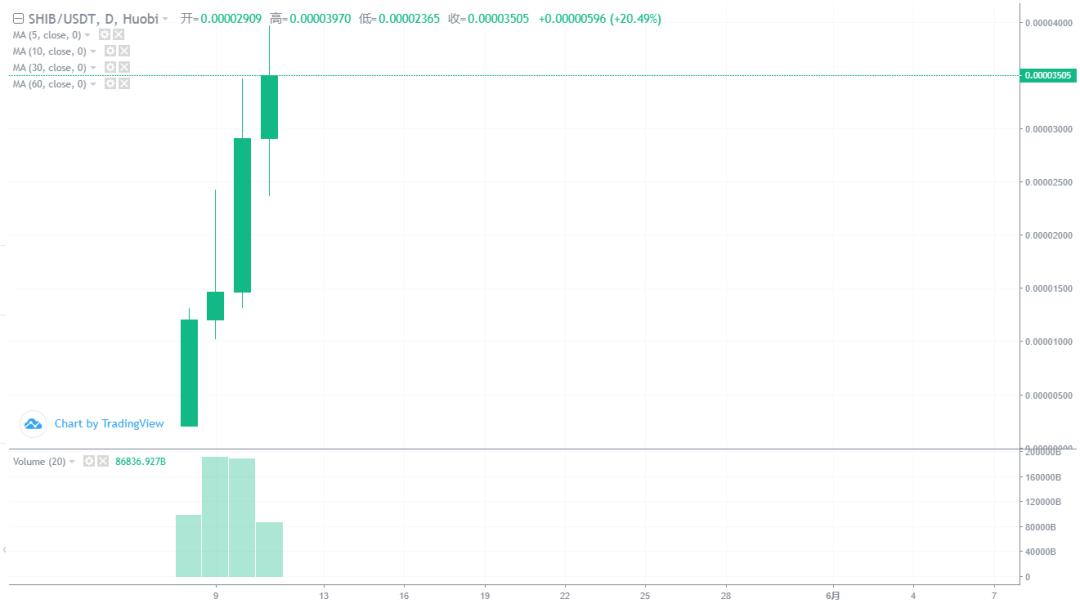 过去短短两三个月,SHIB(俗称SHIB)的涨幅已经超万倍,继狗狗币后再成“传奇”。5月11日,在大多数数字货币走跌的行情下,SHIB价格依然坚挺,最高涨超30%。截止5月11日18:30,SHIB在火币全球站的报价为0.00003454USDT(尾数价为3454)。