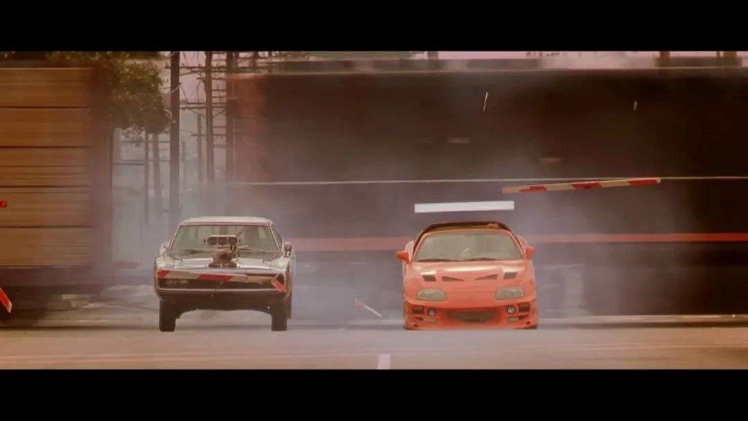 电影的名场面中,唐老大跟布莱恩飙车。在过平交道时,一辆火车疾驰而来,唐老大的车坏了无法刹车。然而,他非但不躲避,反而直接加速向火车冲了过去,唐老大跟布莱恩的车一起飞出平交道,火车唰地从车身后面急速穿过。