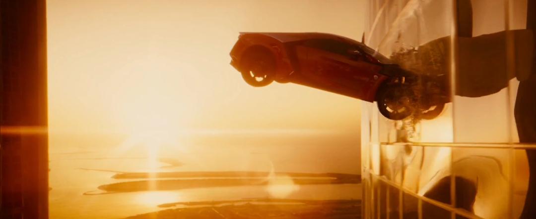 《速度与激情7》有两处名场面,一处是 跑车跳伞 ,唐老大团队从飞机上开出跑车,空中跳伞,豪华跑车在天空散开,视觉惊艳;另一处是唐老大开着红色莱肯超跑,在迪拜帆船酒店 两次飞跃 ,大远景镜头下,跑车与夕阳交相辉映。