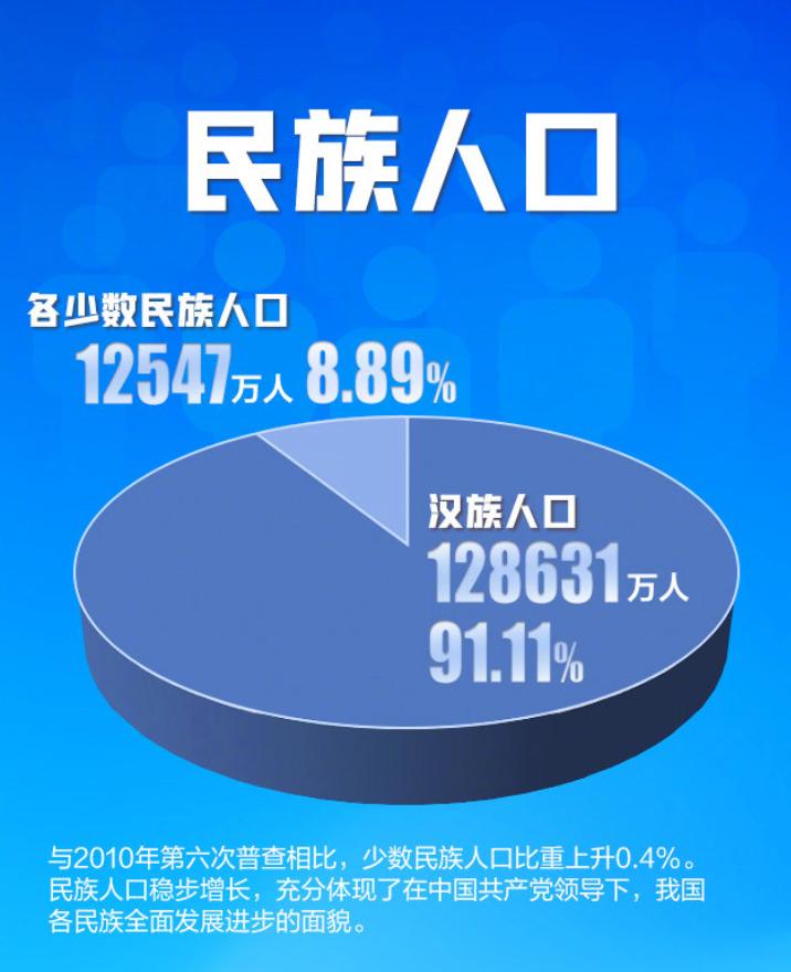 与2010年相比,汉族人口增长了4.93%,而各少数民族人口增长则达到了10.26%,少数民族人口比重因此也上升了0.40个百分点。