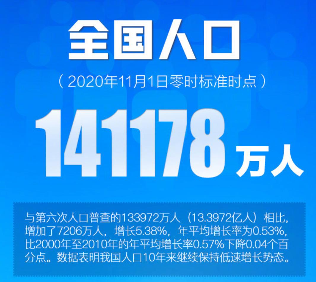 截至2020年11月1日零时,中国总人口数为14亿1178万(不含港澳台籍),这与2010年(第六次全国人口普查数据)的13.3972亿人相比,增加7206万人,增长5.38%,年平均增长率为0.53%,比2000年到2010年的年平均增长率0.57%下降0.04个百分点。数据表明,我国人口10年来继续保持低速增长态势。虽然人口增长率低已成为既定事实,但是中国总人口没有跌破14亿,更没有首次下滑,可以算是一个成功。