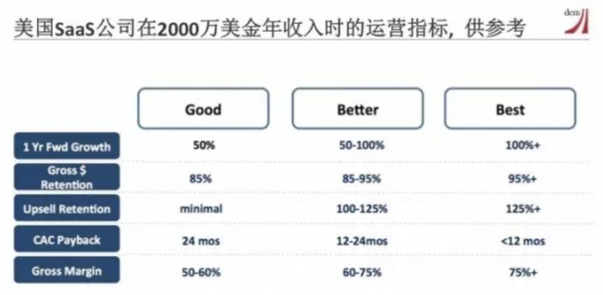 比如著名投资机构DCM就曾给出了SaaS公司估值的六个最关键的估值指标:ARR(年度经常性收入)、%ARR Growth(年度经常性收入增长率)、Retention/Upsell(留存率/增购率)、CAC Payback(获客成本回收期)、%Gross Margin(毛利率)、Burn Rate/FCF(资金消耗率/自由现金流)。