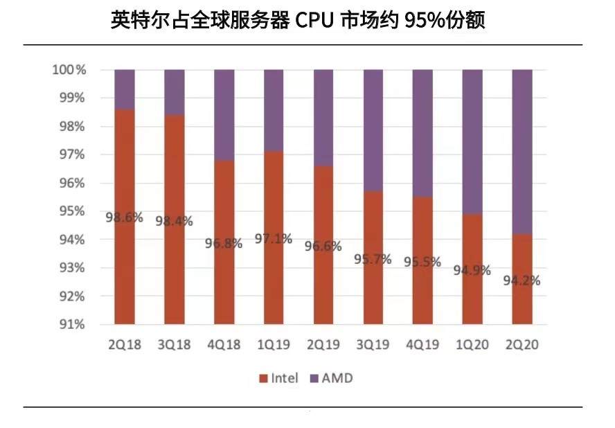 时间来到2020年,根据公司招股说明书与广大证券研究所整理材料显示,在全球服务器CPU市场份额上,英特尔从2018年二季度98.6%下降至2020年二季度的94.2%。而整个2019年都在持续下滑,究其原因,2019年AMD发布7nm芯片,英特尔仍然停留在14nm的优化上,虽然英特尔通过8068系列的“打造”拥有大量的客户,一旦过久没有突破自身,那么绝对的用户粘性是不存在的,在技术更先进的市场,一向主打市场的ADM成为了最好的替代品无可厚非。