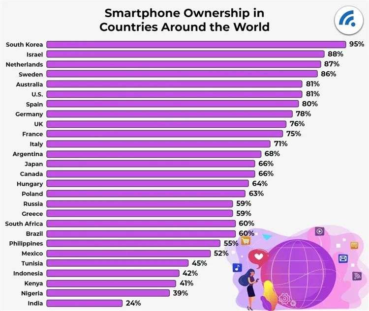 韩国被誉为科技和电子中心,其94%的人口拥有智能手机,这一比例位居全球榜首。剩余的6%人口也都持有非智能的移动设备,因此韩国是全世界唯一一个移动设备覆盖率达到100%的国家。