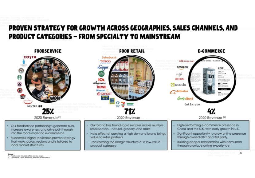 从收入构成来看,餐饮服务、零售渠道和电商渠道在Oatly 2020年收入的占比分别为25%、71%和4%。