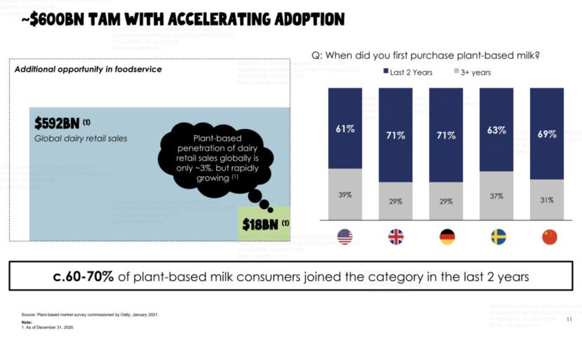 在进入中国市场不到两年的时间里,截至2020年12月31日,Oatly共覆盖超过9500个餐饮服务和零售点,增长率超过450%。