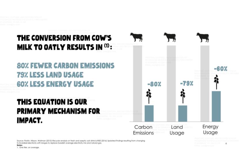 在谈及创业的出发点时,Oatly强调:用一升燕麦代替牛奶,可减少约80%的温室气体排放、79%的土地使用量以及60%的能源消耗。