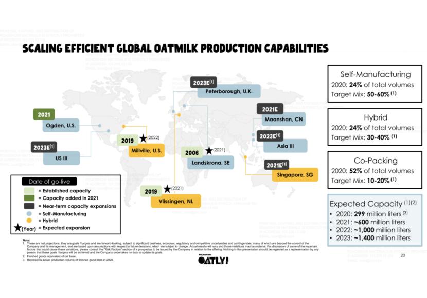 按照Oatly的规划,至2021年,Oatly的生产能力将增到6亿升,至2022年则进一步增至10亿升,至2023年则预计达到14亿升。(注:具体工厂建设预期时间及产能规划见上图,在此不作赘述。)