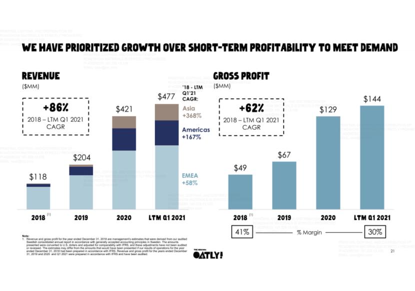 2020年,Oatly的营收为4.21亿美元,较2019年的2.04亿美元增长106.5%,这一增速高于2019年较2018年同比72.9%的增幅;2018年至2021年第一季度的LTM复合年增长率为86%。
