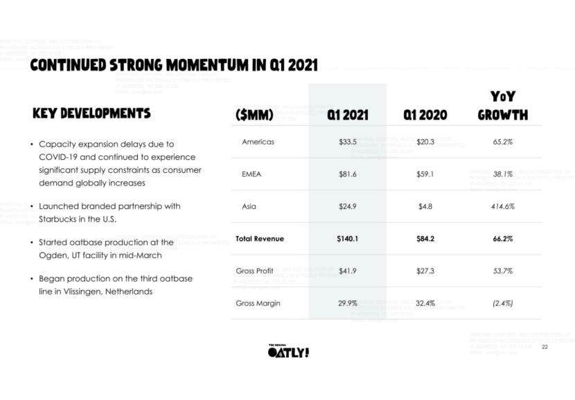 2021年第一季度,Oatly的营收为1.40亿美元,同比增长66.2%;若从市场划分来看,北美洲、以及EMEA(欧洲、中东、非洲)的同比增速分别“仅”为65.2%和38.1%;而亚洲的同比增速则高达414.6%。