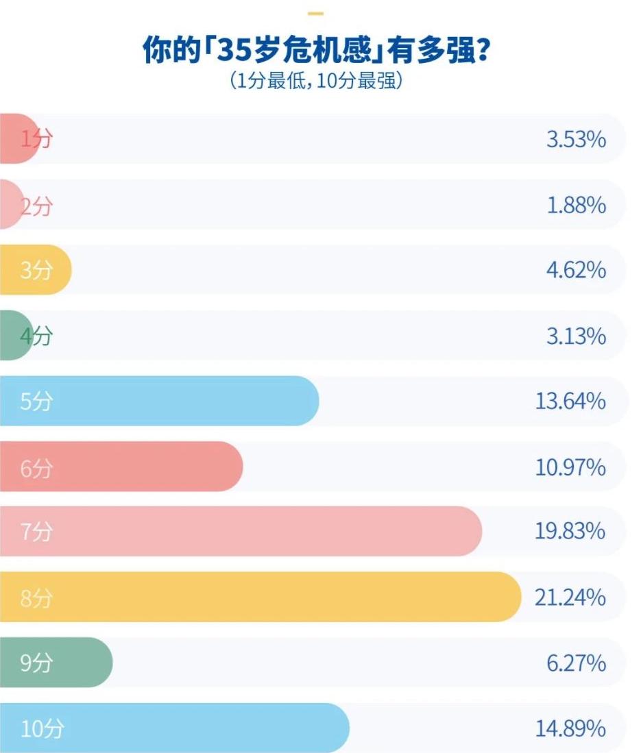 当我们问到「你的35岁危机感有多强」时,86.84%的受访者表示危机感在5分及以上。62.23%的受访者,表示危机感在7分及以上,还有14.89%的受访者表示自己的危机感是10分。