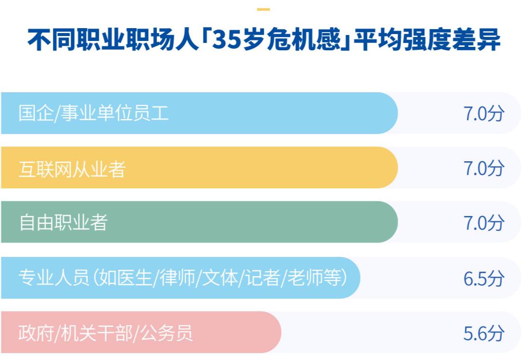 在我们的调查中,国企/事业单位员工、互联网从业者、自由职业者的「35岁危机感」最大,平均值达到7分。可见在快速发展的社会里,不管在什么行业,都没有「完全稳定」的工作。